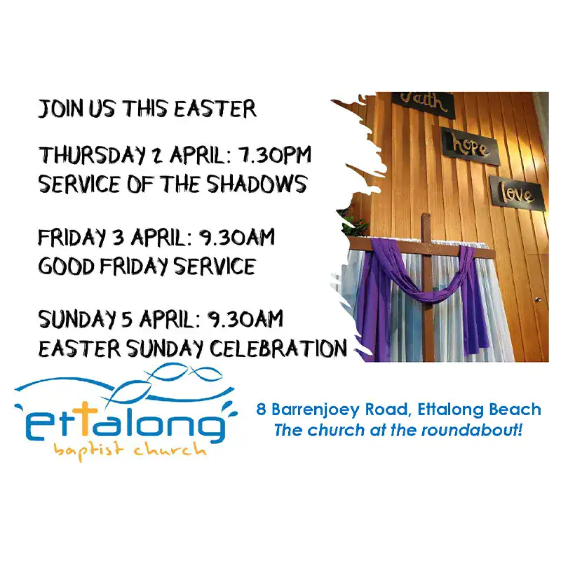 Ettalong Baptist Church is a thriving community, serving people across a broad range of ages. We are located on NSW’s Central Coast.
